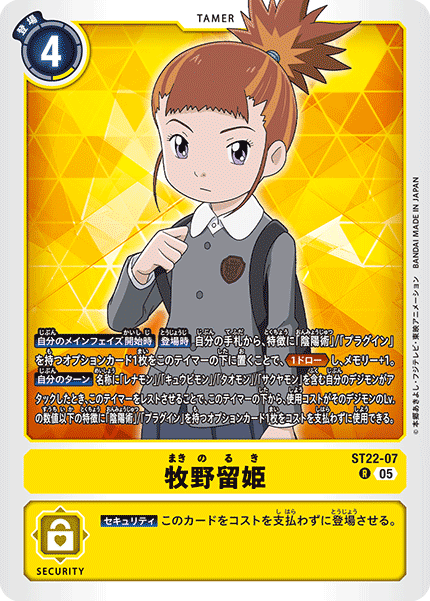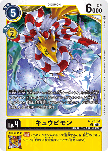 - ①首先讓牧野留姬登場滿足行動卡的顏色條件,並在育成區進化至「ST22-04 祭師獸」。準備完成後,借助「ST22-04 祭師獸」的攻擊時效果使用行動卡,同時通過「ST22-01 小狐獸」的進化元效果進化至「ST22-06 沙古牙獸:巫女型態」!使用「ST22-10 金剛界曼荼羅」抵抗移除、鞏固防守吧。