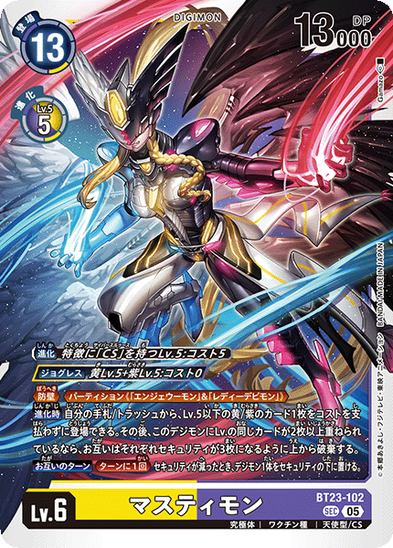 準備完成後,合體進化至「BT23-102 混沌神魔獸」!召喚Lv.5數碼寶貝、同時將雙方的安全區卡牌廢除至3張,並和登場的數碼寶貝《聯手》、發動進攻吧。